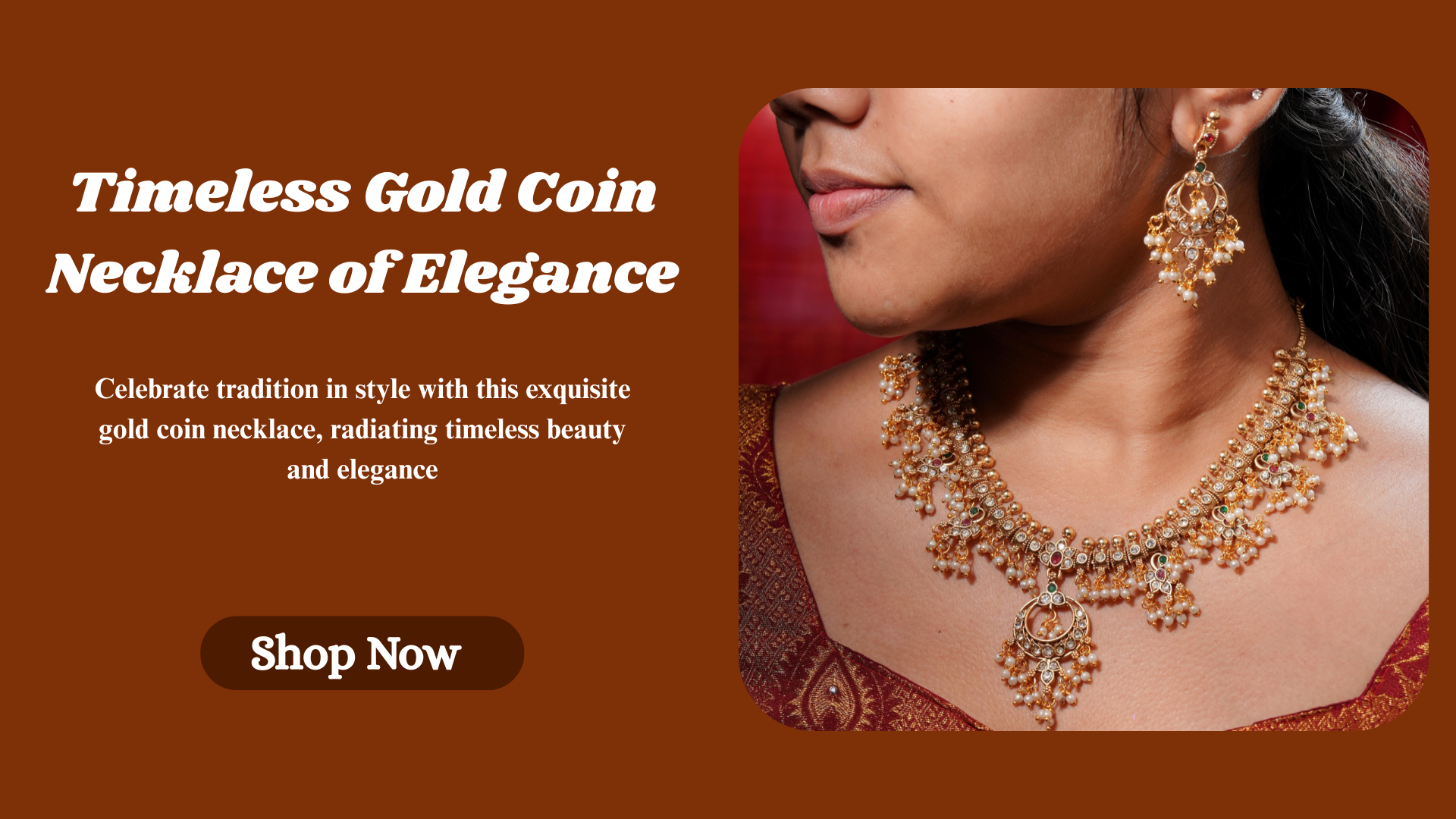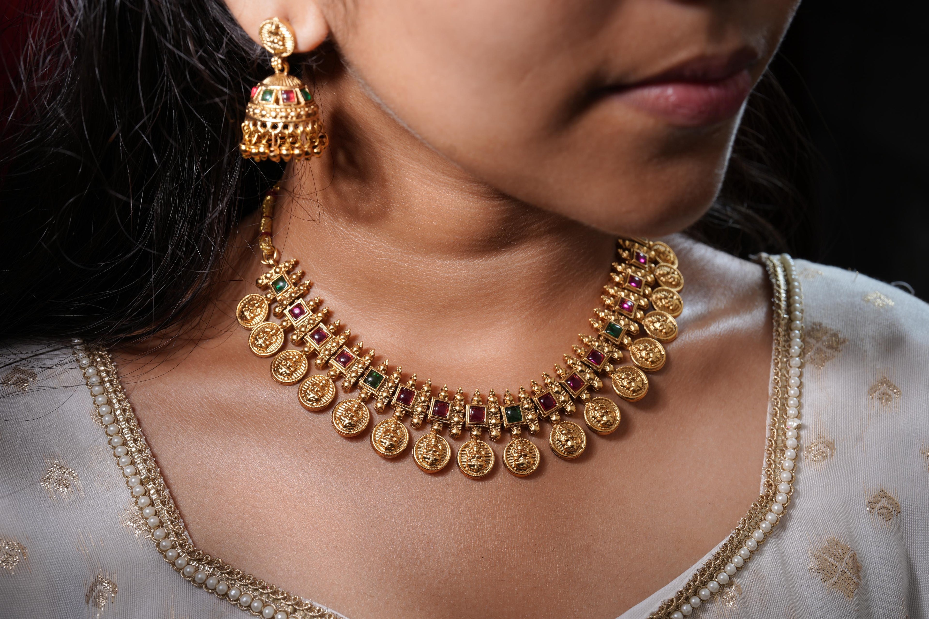 Gracefully traditional A delicate Lakshmi coin necklace adorned with pearls and colorful stones for timeless charm