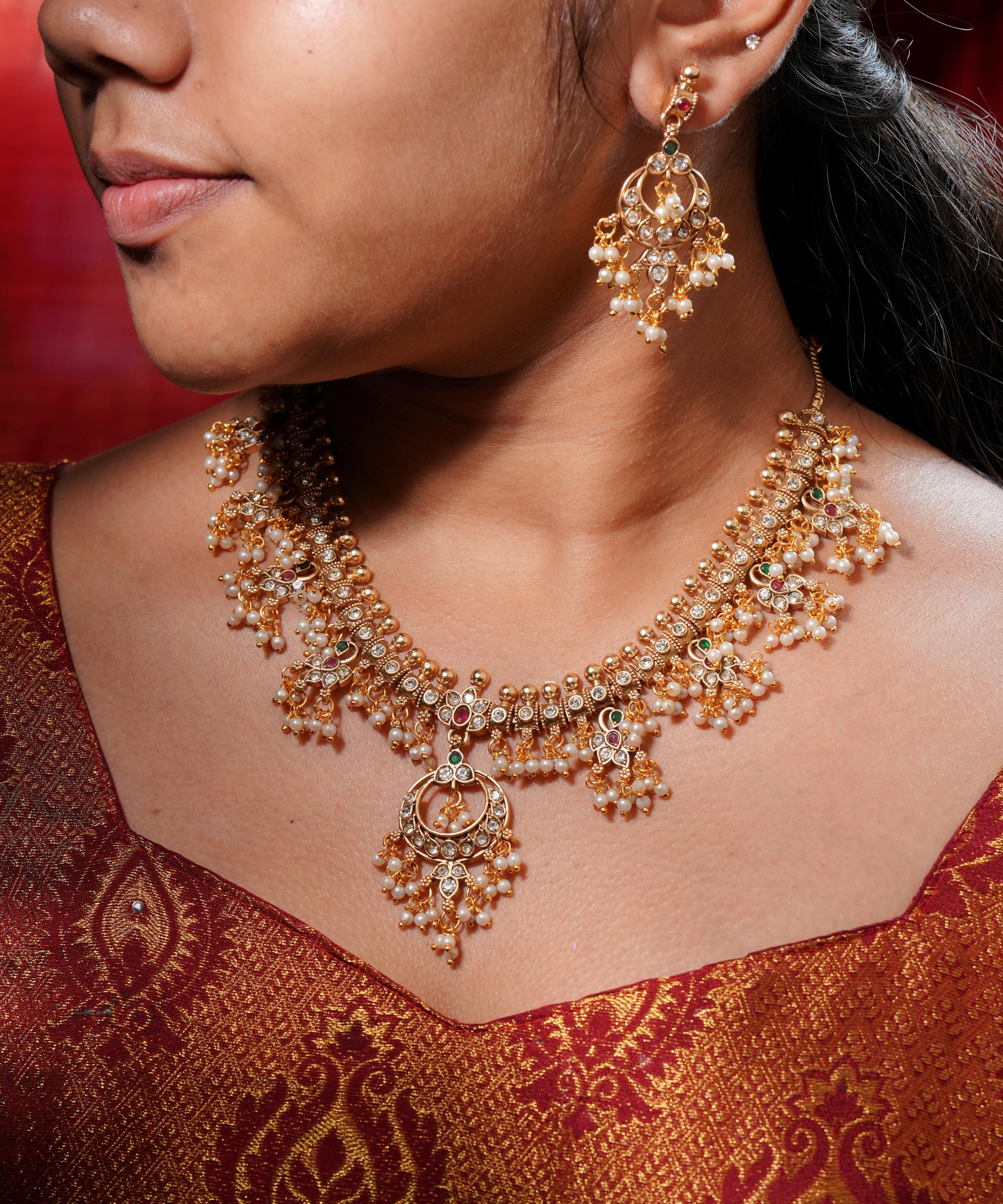Elegant pearl bridal necklace set with matching earrings perfect for weddings and festive occasions