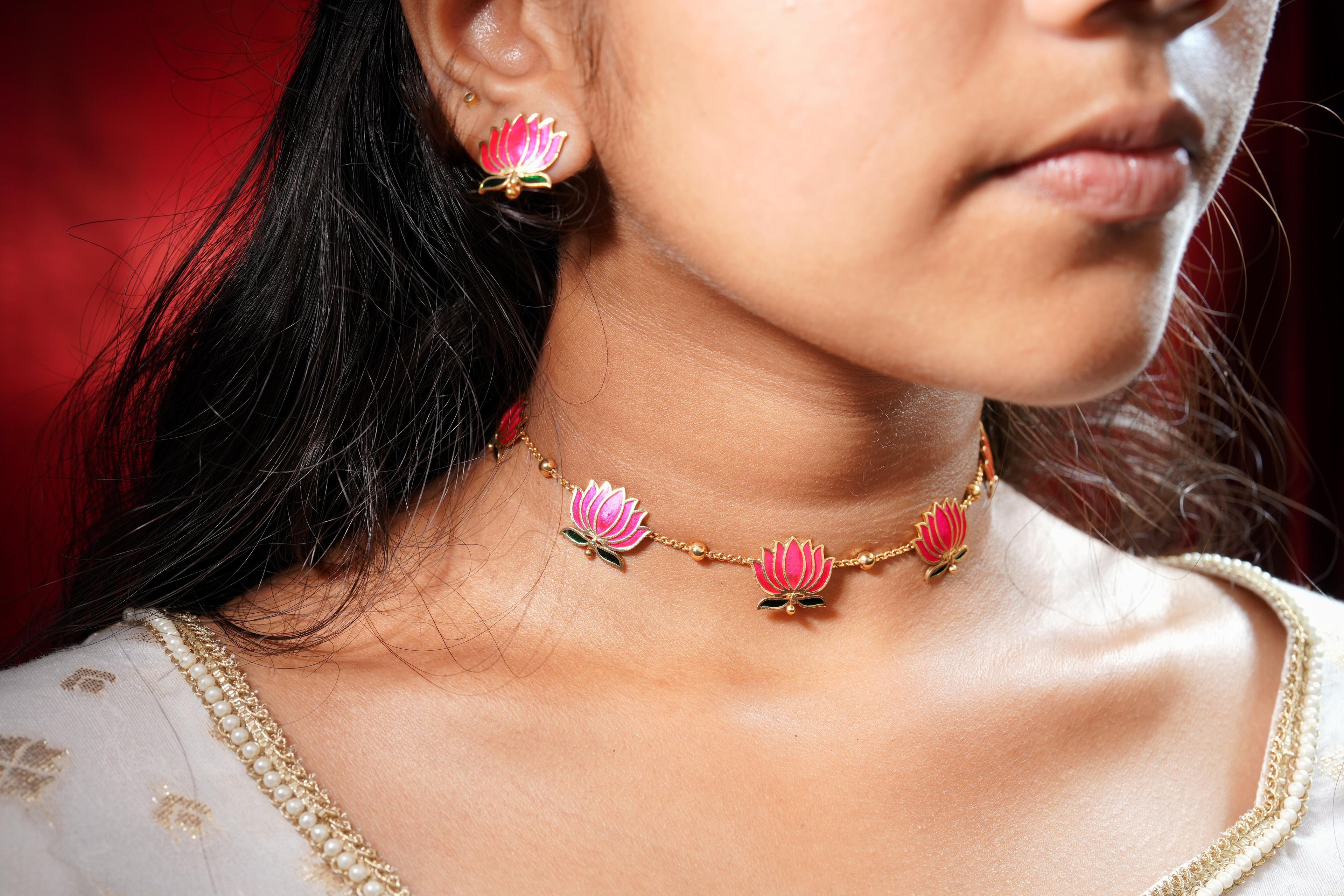 Delicate lotus choker with matching studs – a vibrant elegant touch for festive and ethnic looks