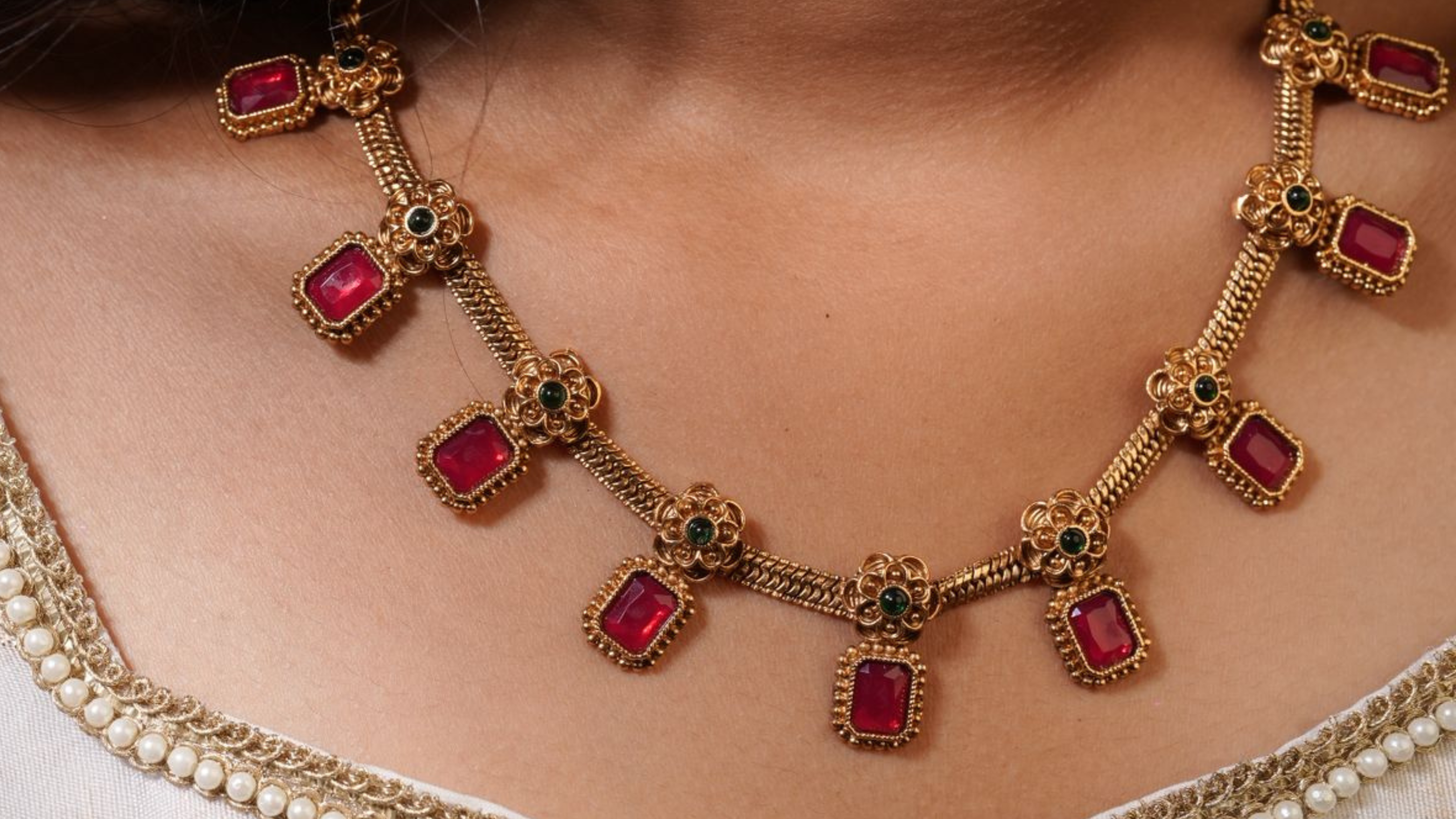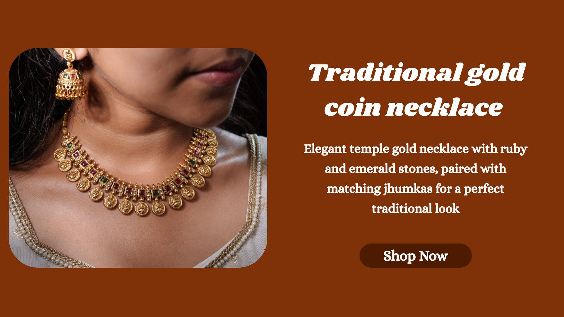 Temple-style gold necklace with ruby emerald and jhumkas — ideal for weddings and festive celebrations