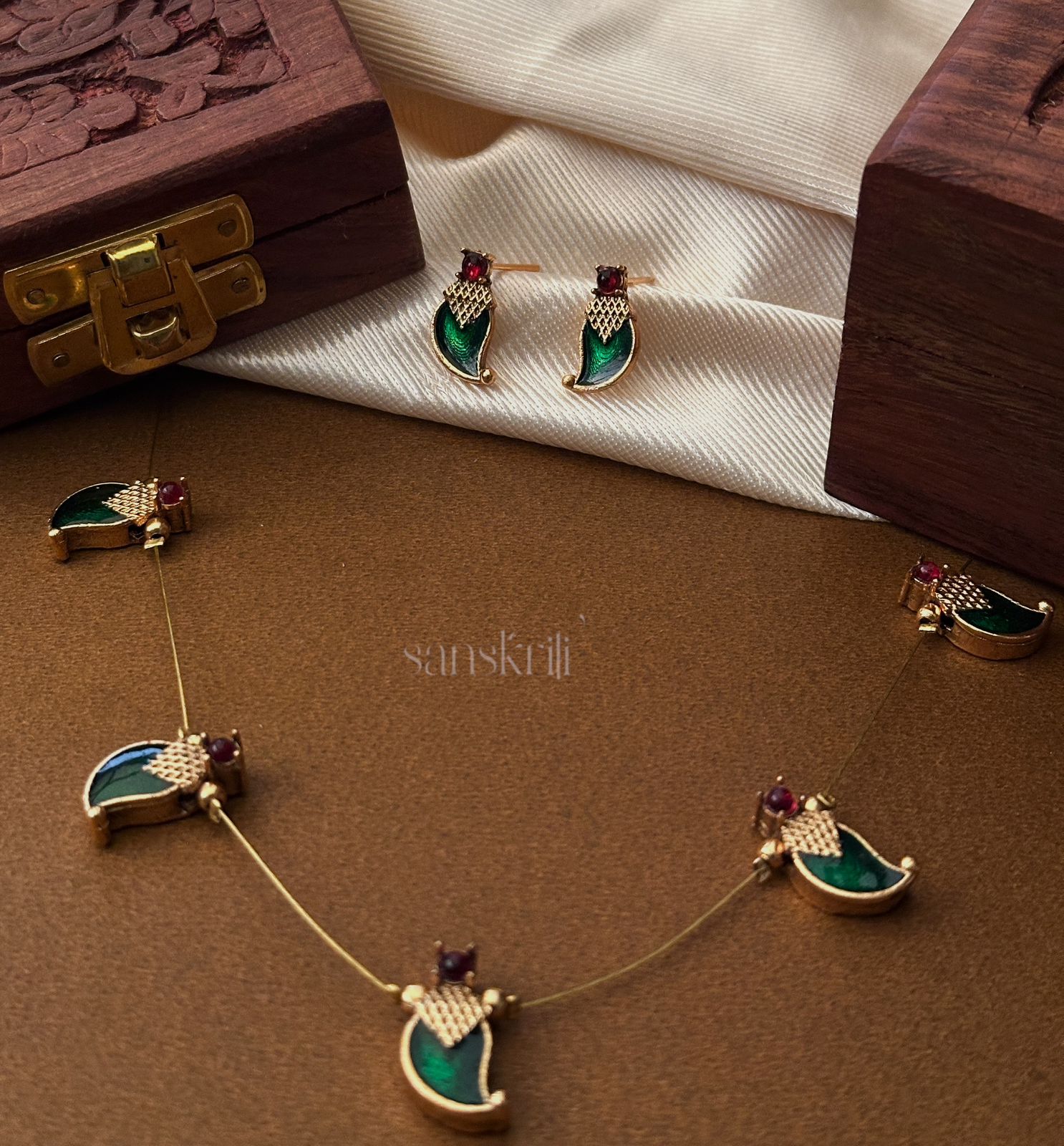This elegant jewelry set features a delicate gold-tone chain necklace with matching stud earrings, both adorned with intricate paisley-shaped pendants in rich maroon and black enamel. The intricate work combines traditional design with a modern touch, perfect for ethnic or festive occasions, enhancing any outfit with sophistication.