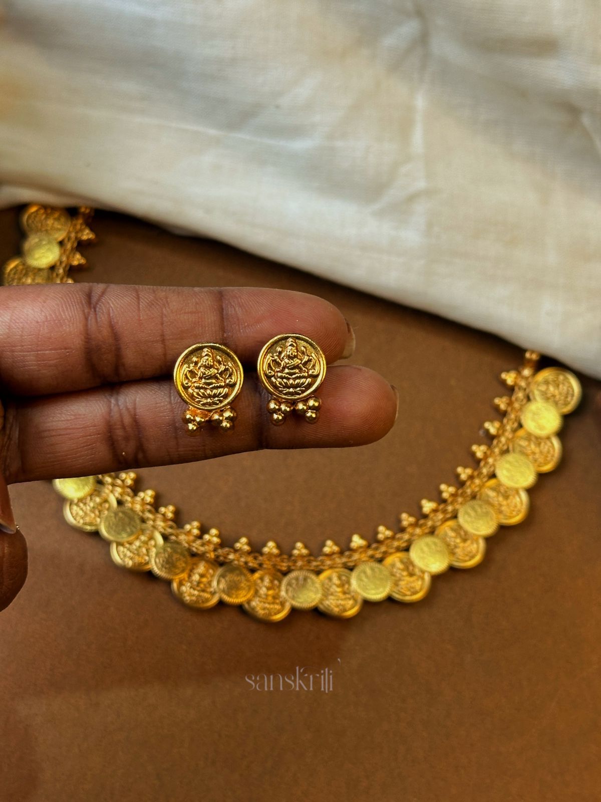 a traditional gold coin necklace set, featuring intricately embossed coins, arranged in a crescent shape, and paired with matching stud earrings. The jewelry is set on a brown backdrop, partially covered with an elegant, off-white silk fabric, exuding regal and cultural charm