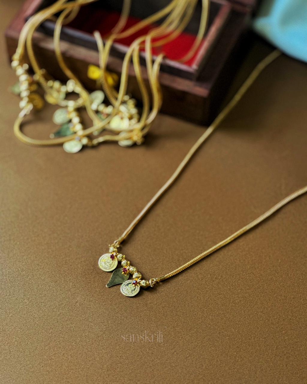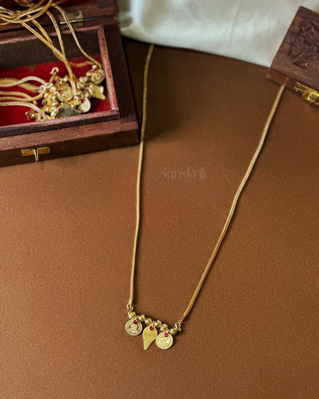 This delicate gold-toned thali features a slim, textured chain adorned with a central cluster of traditional motifs. Two round coin-like charms flank a small triangular pendant, accented by tiny gold beads and subtle red stone details. The design blends classic South Indian temple jewelry aesthetics with a minimalist, contemporary feel, making it ideal for daily wear or festive occasions. Lightweight and elegant, it pairs beautifully with both ethnic outfits and simple kurtas or dresses. Perfect for those who prefer understated yet culturally rooted jewelry that adds a refined touch without overpowering the overall look.
